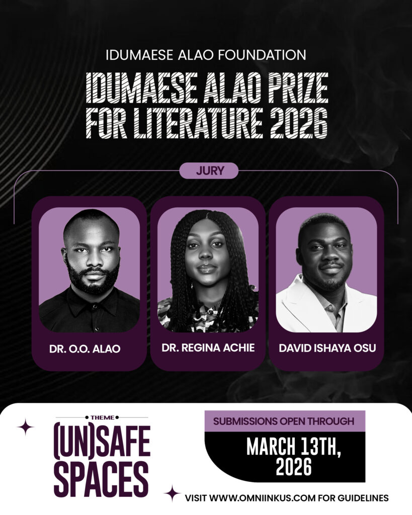 Idumaese Alao Foundation (IAF) is hereby calling for entries for the Idumaese Alao Prize for Literature 2026. Now in its third year, the prize was instituted in 2024 in memory of Idumaese Alao, to spotlight and reward talented writers and literary artists across Nigeria, Africa, and the world at large. The genres under focus are Poetry, Short Story, and Creative Nonfiction. The 2026 jury comprises the Nigerian writers, literary critics and scholars Dr. O.O. Alao, Dr. Regina Achie, and David Ishaya Osu. In addition, the prize is worth Three Hundred Thousand (300,000) Naira, to be shared among three winners.